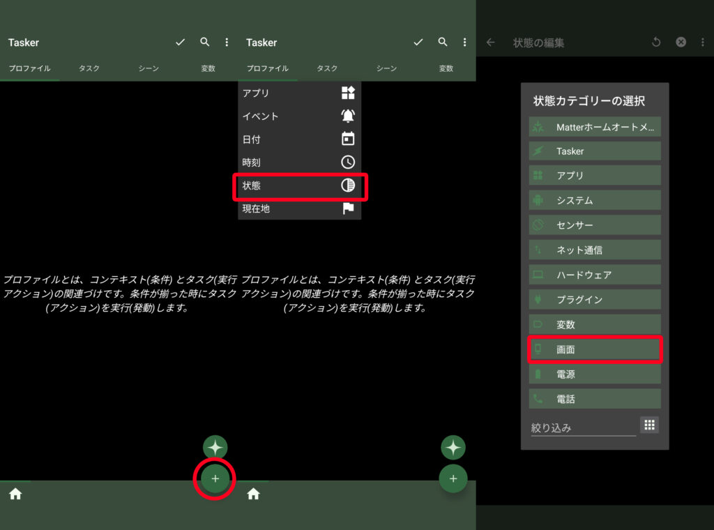 画面右下の【+】をタップします。プルダウンメニューの【状態】をタップ。ポップアップの【画面】をタップ。