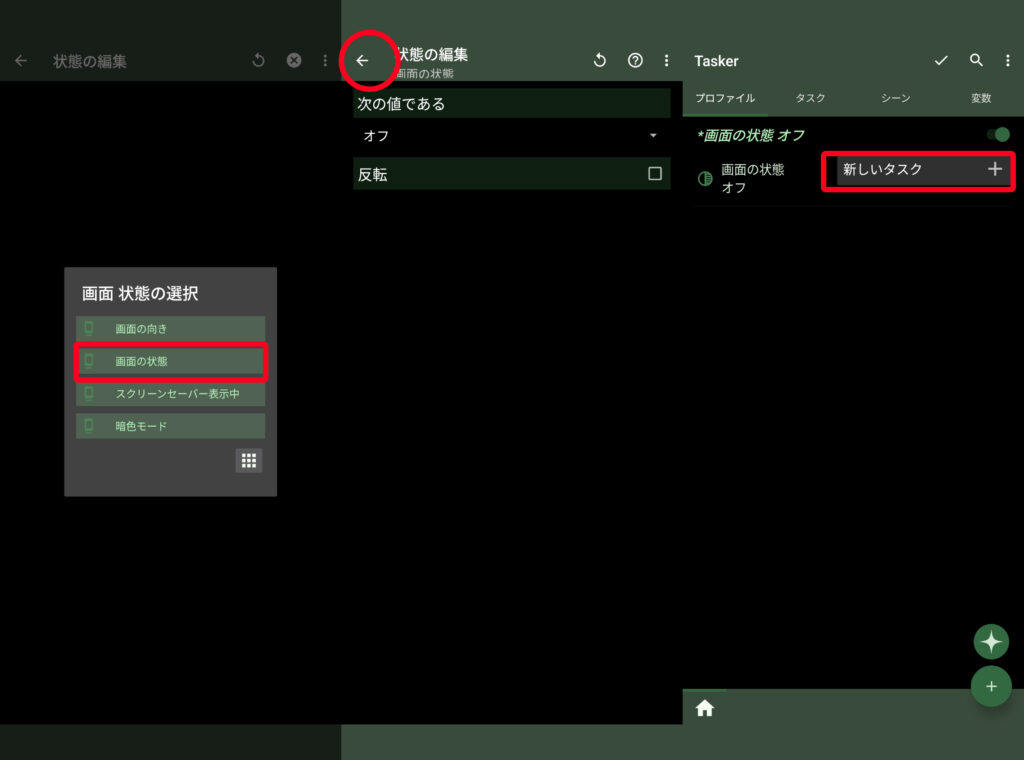 さらにポップアップで【画面の状態】をタップ。この画面はデフォルトでOKなので、左上の【←】で戻ります。【新しいタスク】を選択。