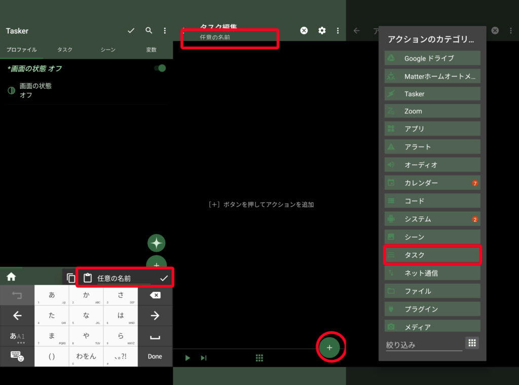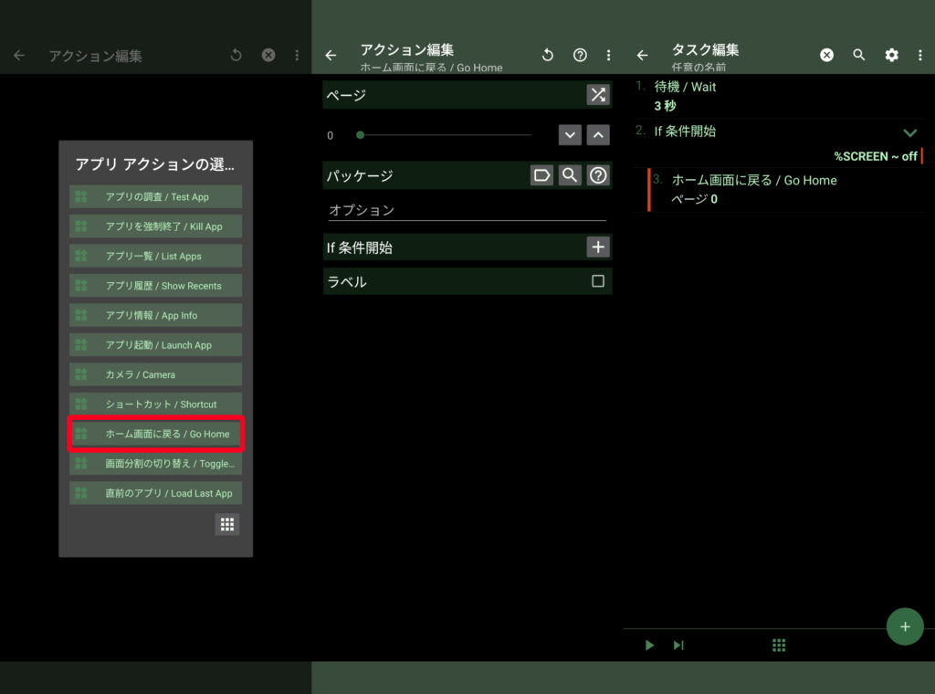 ザックリ言うと、AndroidOS上で簡単なプログラム(iOSでいうショトカット)が動かせます。今回の場合は、画面が消灯しているタイミングで、ホーム画面に自動で戻るというプログラムを”Tasker”上で組むのです。
