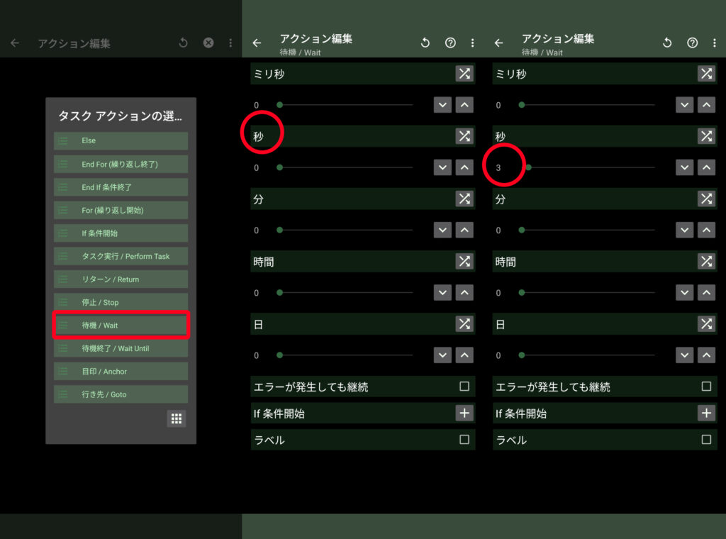 ポップアップの【待機/Wait】を選択。待機時間の設定ですが、経験上3秒程度が使いやすいと思います。この待機時間とは画面が消灯してから、何秒後に次のタスクを実行するかを指定しています。