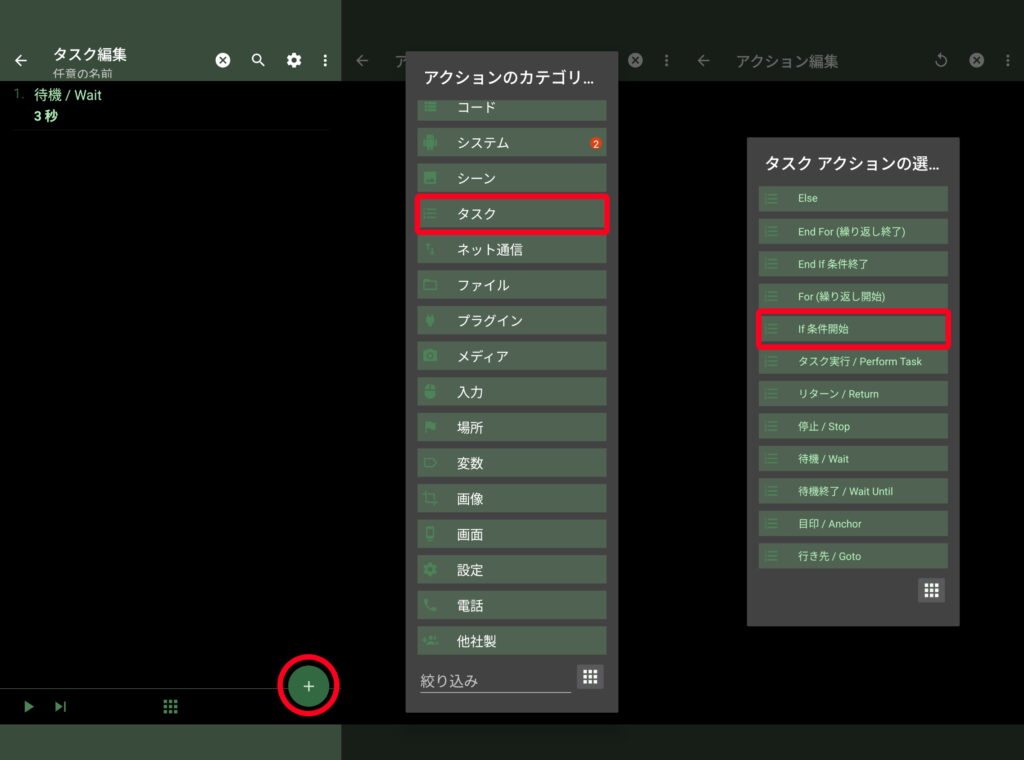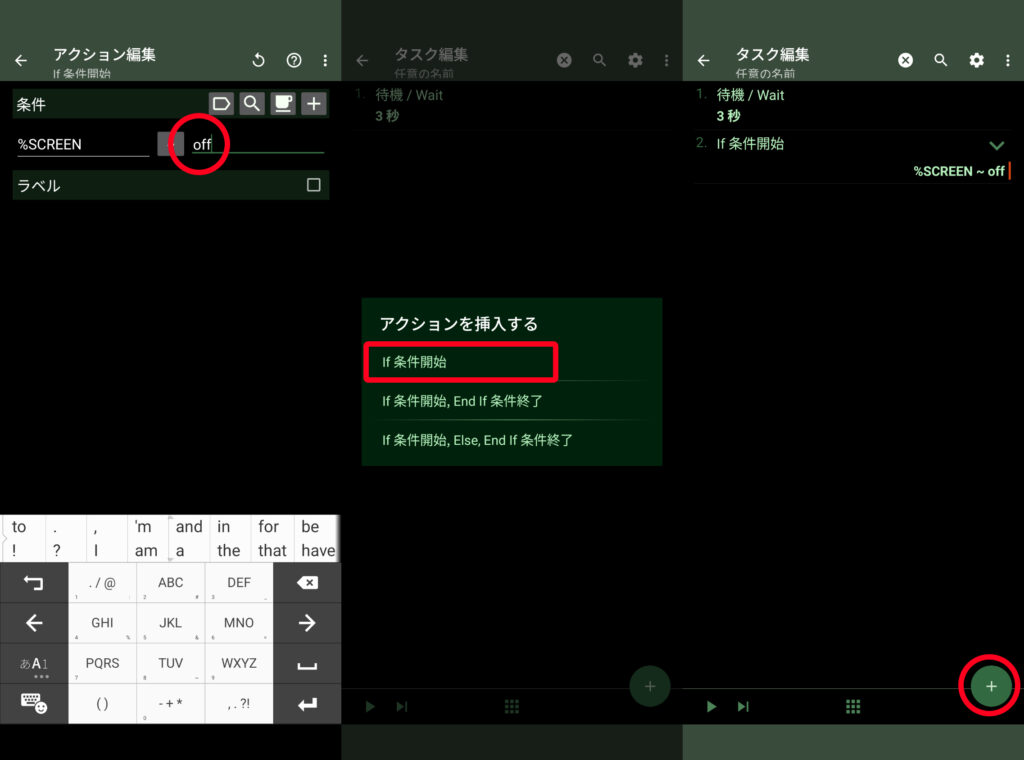 テキストボックスの後半には”off”を入力。ポップアップでアクションの選択が出るので、【if条件開始】を選択。画面切り替わり、右下の【+】をタップ。