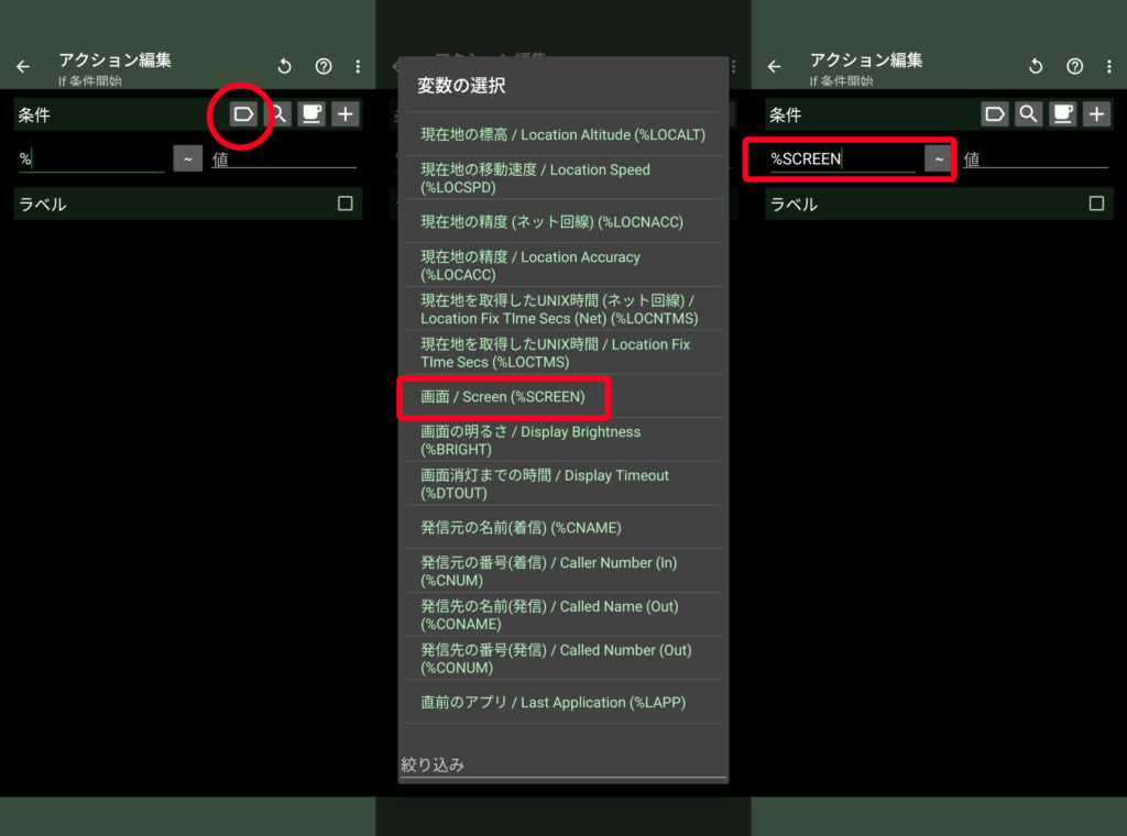 ○の部分をタップすると【変数の選択】がポップアップ、【画面/Screen(%SCREEN)】を選択。条件前半に(%SCREEN)が入力されます。