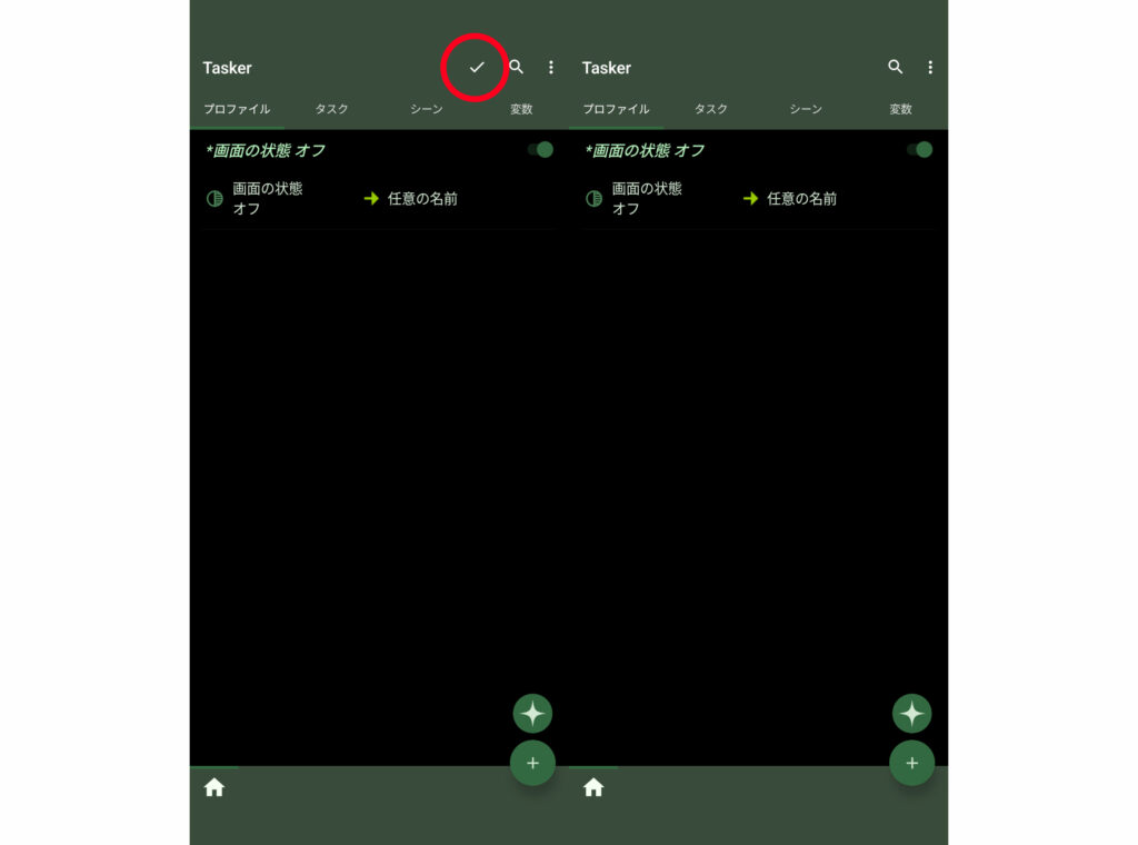 私の理解不足なのですが、”Tasker”のトップ画面に戻った時、【チェック】は表示されている場合は、タップして起動(?)すると動き始める様です…この辺りの動きがイマイチ理解できていません…起動に関してのトグルがよく分かりませんm(__)mどなたか教えていただけると嬉しいな…