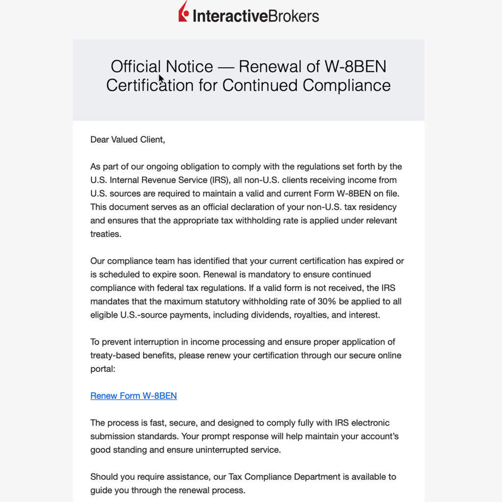As part of our ongoing obligation to comply with the regulations set forth by the U.S. Internal Revenue Service (IRS), all non-U.S. clients receiving income from U.S. sources are required to maintain a valid and current Form W-8BEN on file. This document serves as an official declaration of your non-U.S. tax residency and ensures that the appropriate tax withholding rate is applied under relevant treaties.