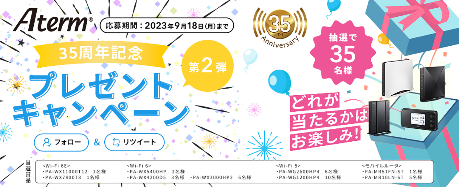 フォロー&リツイートでAtermが抽選で35名様に当たる!Aterm 35周年 X(Twitter)プレゼントキャンペーン第2弾[応募締切 2023年9月18日(月)まで]